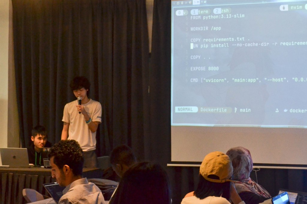 Aiden then walked everyone through Dockerfiles, breaking them down in a way that was easy to follow. Instead of just showing code, he explained what each line actually does and why it matters. Participants got to try building their own Dockerfiles, with guidance from both the speaker and committee members whenever they got stuck.